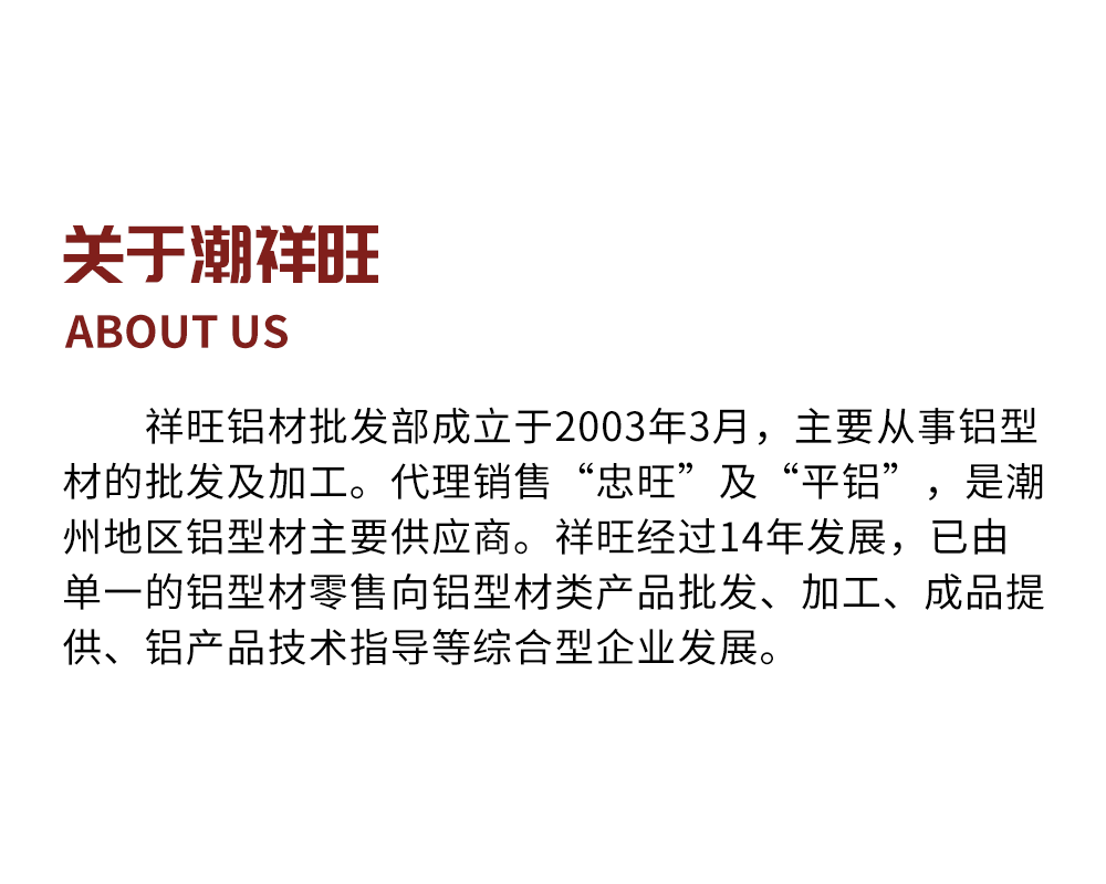 - 祥旺鋁材批發部成立于2003年3月,主要從事鋁型材的批發及加工。